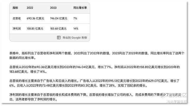你还可以让Bard生成一份某上市公司财报的数据表格,并得到来自机器人的数据解析,比如这家公司营收增长的来源。当然,你也可以让Bard分析得“专业一点”、“简短一点”、“详尽一点”、“轻松一点”、“简单一点”,这已经是目前市面上连网对话机器人的基操了。而Bard的扩展功能是,可以一键导出为表格,供用户在办公软件上进行图表的编辑。