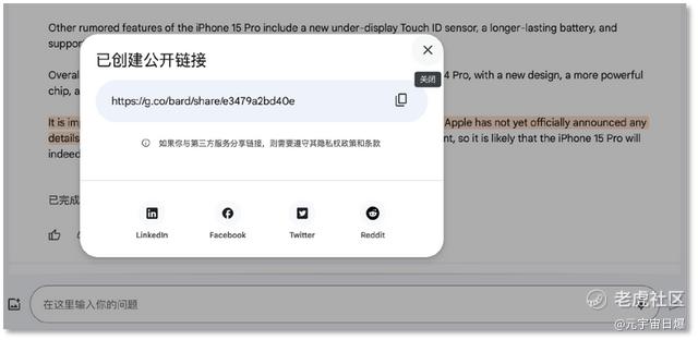 假如你是一名科技圈的写手,你可以让Bard撰写一份iPhone15测评,现在,它能做到一键保存至谷歌文档,供你润色修改。如果你觉得内容太过主观,你还可以分享当前的对话链接至Linkedin、Facebook、Twitter、Reddit四个社交平台,邀请他人参与对话讨论,且对话停止一段时候后,讨论仍可以接上文继续。