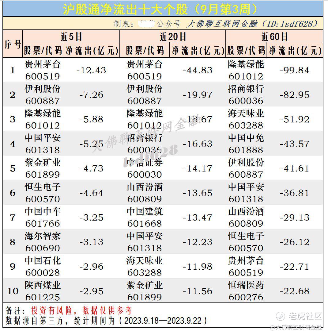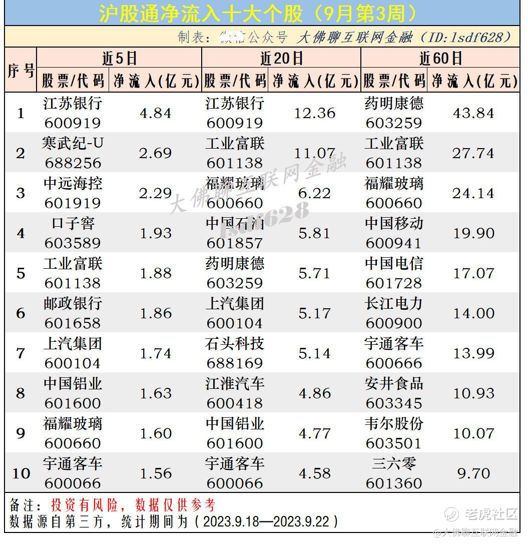 沪股通资金近5日近20日和近60日资金流入/流出前十股票: