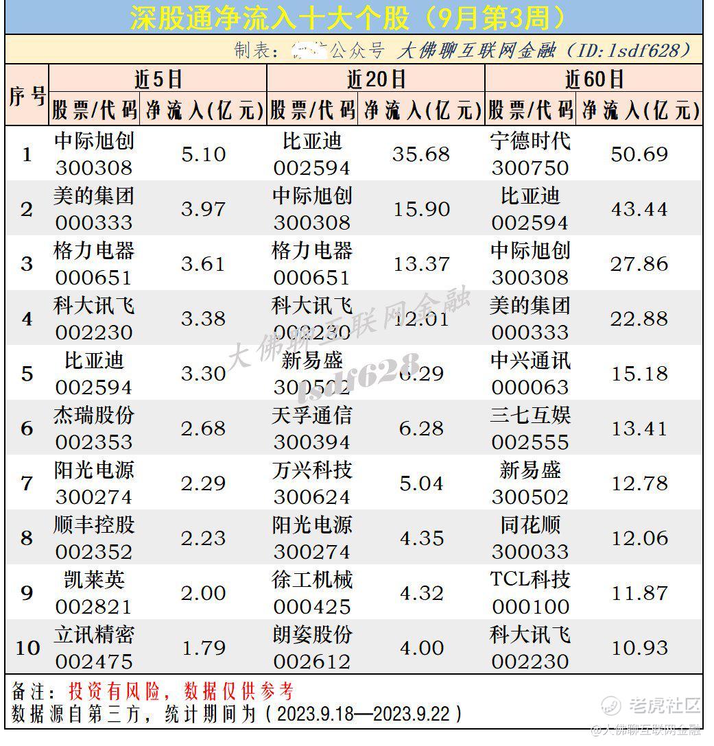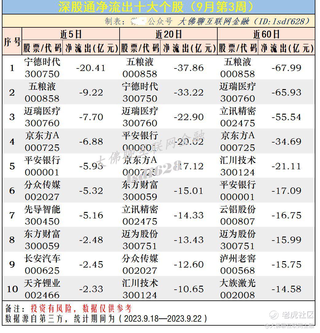 深股通资金近5日近20日和近60日资金流入/流出前十股票: