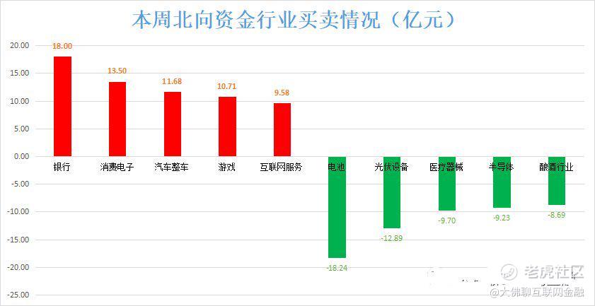 本周北向资金增持了41个行业,增持居前的行业是银行、消费电子、汽车整车、游戏、互联网服务,分别净流入18亿元、13.5亿元、11.68亿元、10.71亿元、9.58亿元;相反,减持了45个行业,减持居前的行业是电池、光伏设备、医疗器械、半导体、酿酒行业,分别净流出18.24亿元、12.89亿元、9.7亿元、9.23亿元、8.69亿元。