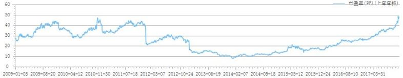 不过值得一提的是,历史数据未必能够简单用来对比,因为公司所处的发展阶段未必相同,公司所面临的竞争环境未必相同。下图为2009年-2017年贵州茅台的PE(TTM),历史最大市盈率为2010年11月的44倍,最小市盈率为2014年1月的8.9倍。