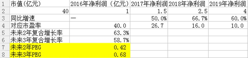 这个指标需要结合市盈率来应用,也就成了另外一个指标PEG,PEG=PE/未来复合增长率。假设2016年-2019年净利润不低于1亿、1.5亿、2.5亿、4亿,那么未来3年复合增长率=(4/1)^(1/3)-1=58%;未来2年复合增长率=(4/1.5)^(1/2)-1=63%。