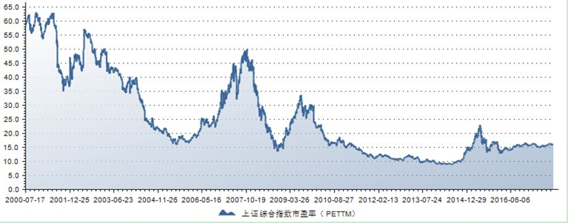 历史PE可作为个股未来估值的重要标准,观察历史PE,给予未来相对靠谱的PE估值,这样计算出来的股价空间也相对靠谱。东方财富的choice可以查询相关个股的历史PE。如图所示的上证综合指数PE(TTM),最低时为2014年4月的9.23倍,目前为16倍。