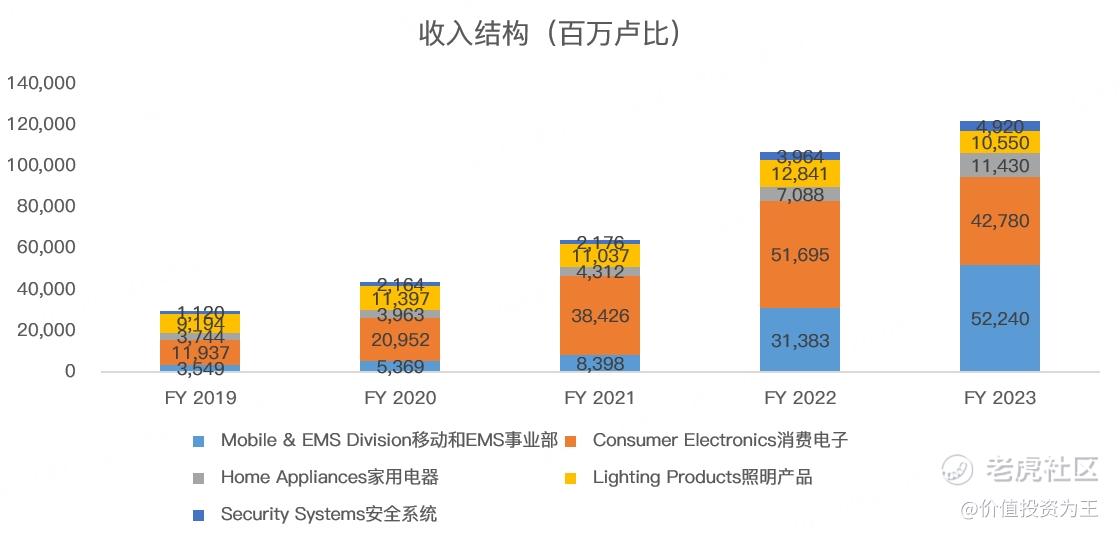 从营收结构来看,手机及EMS事业部贡献了42.9%的收入,其次是消费电子,占比35.1%,其余包括家用电器、照明产品和安全系统:
