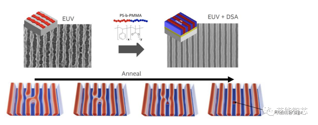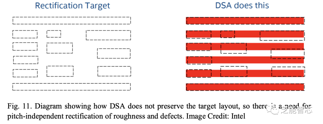 减少线/空间光刻胶修正误差的一种策略是通过定向自组装(DSA),因为它可以修复小于节距的缺陷。
