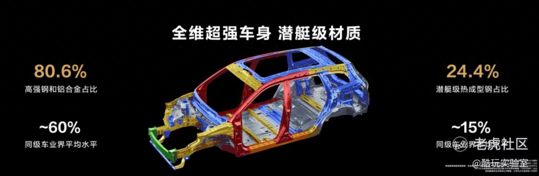问界新M7全车潜艇级热成型钢占比24.4%,这种强度的钢材一般用在潜艇上,每平方厘米可承受17吨重量,相当于一台重型卡车的重量,给足了安全感。另外,该车还运用CBS复合车身材料,有效提升车辆疲劳耐久、车身刚度和碰撞安全性能。