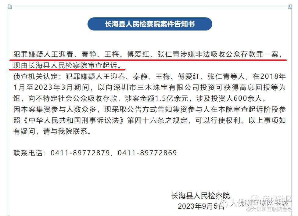 2023年9月5日,案件告知书发布。对犯罪嫌疑人王迎春、秦静、王梅、傅爱红、张仁青涉嫌非法吸收公众存款罪一案进行起诉。