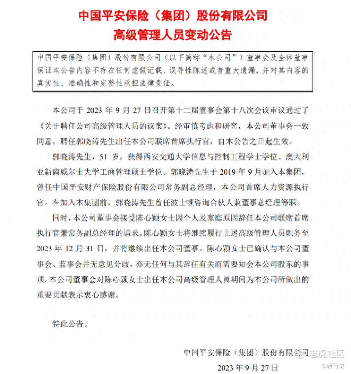 9月27日,中国平安发布公告称,该公司董事会接受陈心颖因个人及家庭原因辞任联席首席执行官兼常务副总经理的请求,同时聘任郭晓涛出任该公司联席首席执行官。