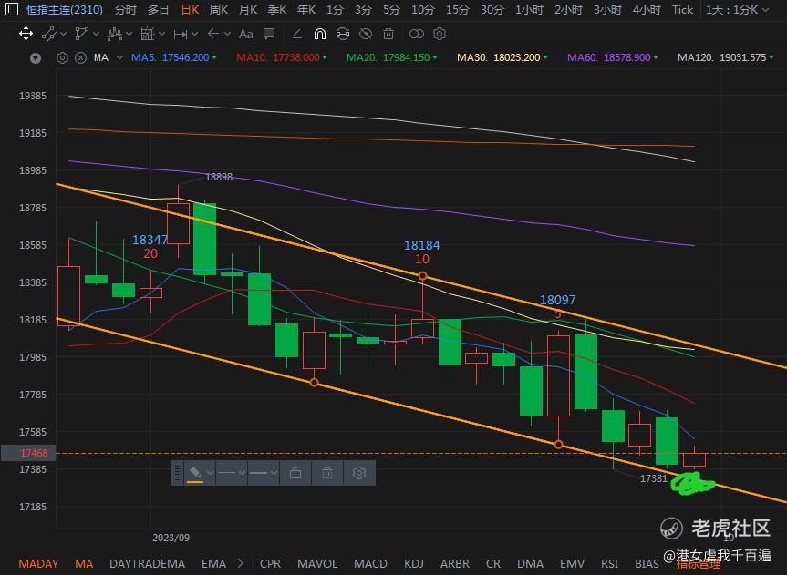 周三晚上恒指收在17700压力位,没有突破上去,夜期缓慢爬升就不是啥好事。今天早上开盘假冲高后跳水,盘中反弹起一点点又打下去,小周期分钟线阴跌不断,细想也实属正常,皆因今天期结日+北水放假前最后一天,本就预期不会有什么大动作。日内搞个空单意思意思一下得了,赚几个月饼钱收工,安心过节去。盘面上个股也没有什么特别,唯独美团继续搞事情,连续弱势了几天,今天更加跌成狗,形成单边向下的趋势,有没有空它的小伙伴?简直节前空头大红包啊。而恒指则继续找底部,下面没啥支撑,如果画一条通道的话,勉强可以看17310作为支撑。上方的压力大到飞起,17530/17600/17740都是压力,没啥消息的话,估计港股冲不上去。