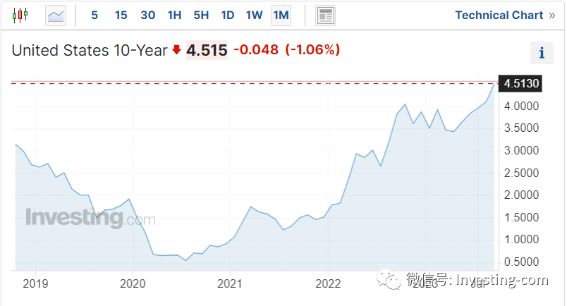 美国十年期国债收益率周二涨至了4.566%,这是2007年10月以来从未有过的水平,不过截至发稿,其回落至4.51%。