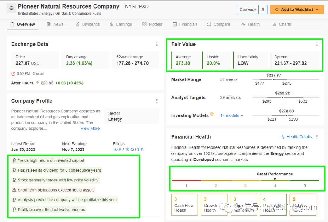 (Pioneer Natural Resources的InvestingPro评估页面)
