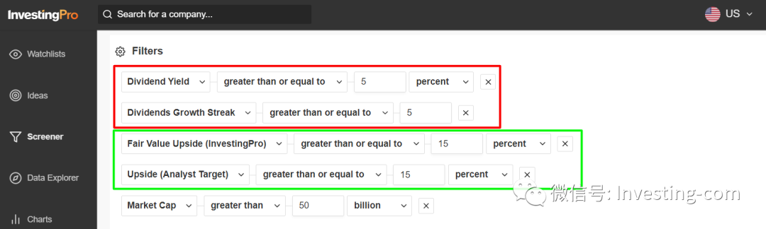 我们的筛选条件是,股息率至少5%,股息连续增长超过或等于5年的股票。与此同时,在InvestingPro的公允价值模型以及华尔街分析师目标价评估中,至少具有15%上行空间的个股。最后,是需要市值在500亿美元以上的公司。