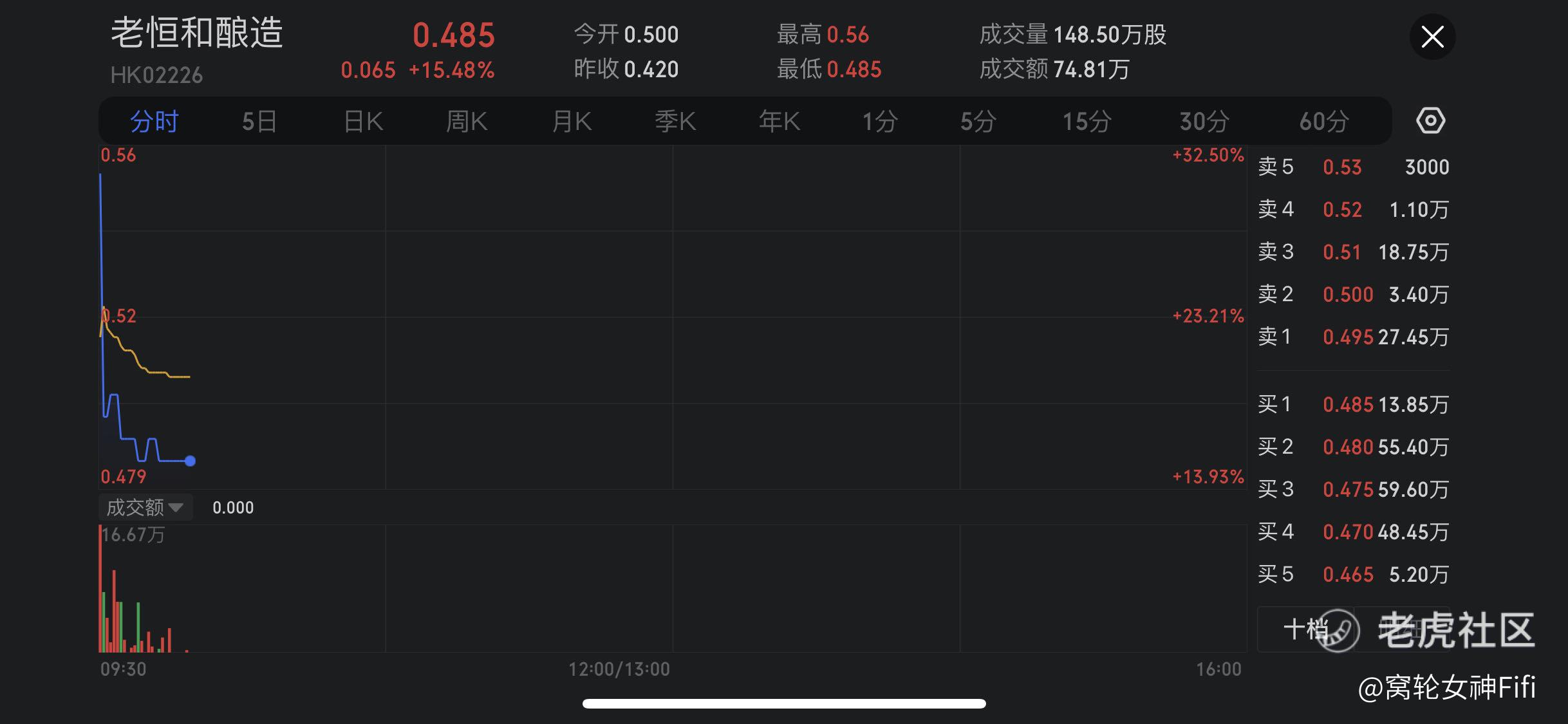 $老恒和酿造(02226)$ 复牌,早盘高开逾19%。截至发稿,涨15.48%,报0.485港元,成交额74.81万港元。