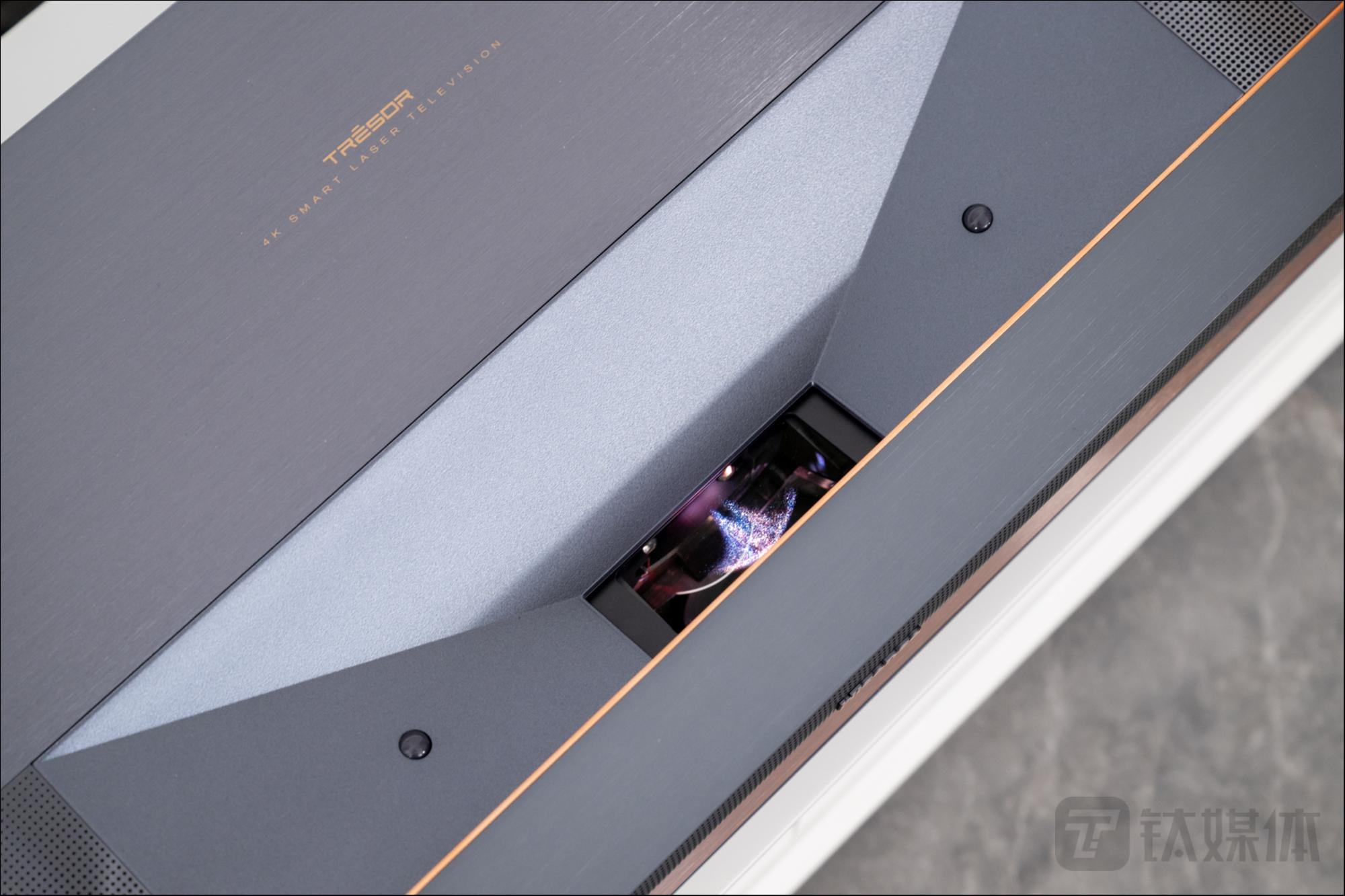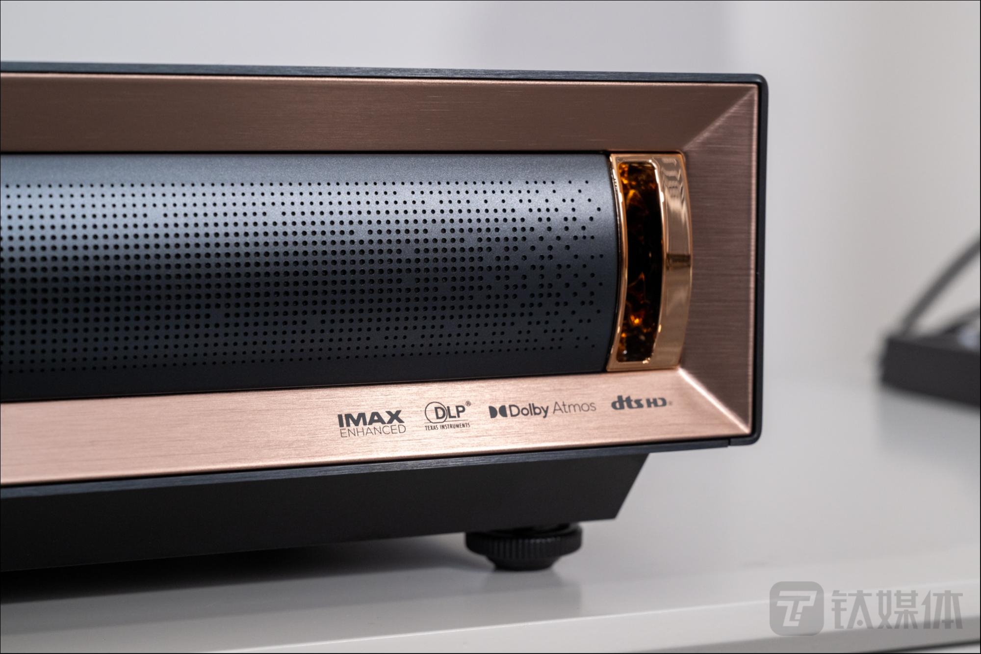 好看、好听是体验核心,细节设计上海信也下了很多功夫,100L8K激光电视的主机结构更加紧凑,深灰与玫瑰金色的搭配也非常符合当下简约的装修风格,机身正面可以看到包括IMAX Enhanced、杜比全景声哈曼卡顿等认证与标识,体现出产品技术内核。