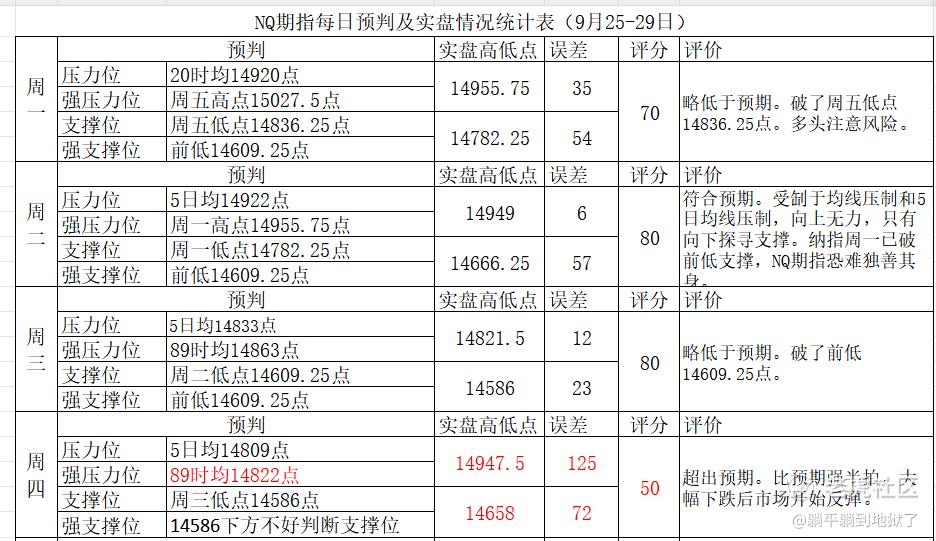 躺观大盘(NQ100期指):周三收盘:0.28%,放量探底回升带长下影线小阳线。破了前低14609.25点,略低于预期。消息面:美股收盘:市场暂获喘息,三大指数集体收涨!芯片股引领反弹,AMD涨近5%。美联储主席鲍威尔:公众的理解是美联储对经济产生影响的关键。美国政府关门近在咫尺,白宫员工被告知做好休假准备。美国二季度实际GDP终值和上周首申失业救济人数均不及预期,但维持韧性。美国官方估算过去六年家庭储蓄下修1.1万亿美元。美国楼市寒冬远未结束,销售先行指标创新冠疫情初期以来新低,30年期固定按揭贷款利率升至7.31%,创20多年最高。美国工会将涨薪幅度要求降低至30%,三大汽车股转涨。$高盛(GS)$上调美国10年国债收益率年底预期至4.3%。技术面:短期:5日均上,20日均下,20均向下,5日均走平,10日20均线向下发散,短线空头趋势。中期:20周均下,中期空头趋势。神奇9转日线低9后2天,走势分析:纳指周二下探未破前低14586点,盘中强力反弹收盘站上5日均线,形成日线级别绝地反击,可小仓位博反弹,反弹目标位20日均线,止损位5日均线。如反弹到20日均线,大概率还要跌。指数到底怎么走,拭目以待。