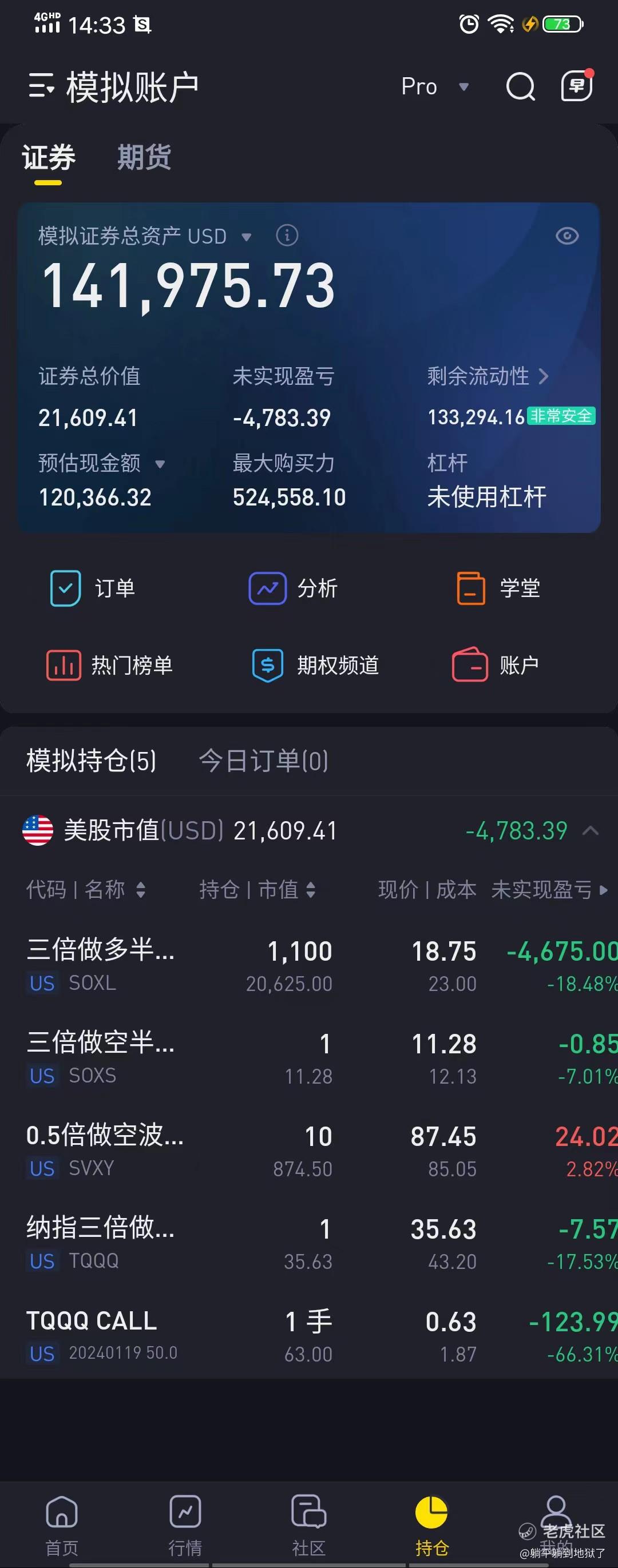 【10万美刀模拟盘】(主要操作TQQQ、SOXL正股和期权)。个人用520战法操作。周四主要操作:1、SOXL相关。没有操作。2、TQQQ相关。获利清6手PUT。3、SVXY:未操作。周五计划:盘前加仓正股,盘中视情况加仓多头期权。(持有CALL多次大幅回辙教训:收盘破5日均清仓CALL,正股减仓或上保护;收盘破20日均线,全部清仓。附:模拟盘持仓收益截图)