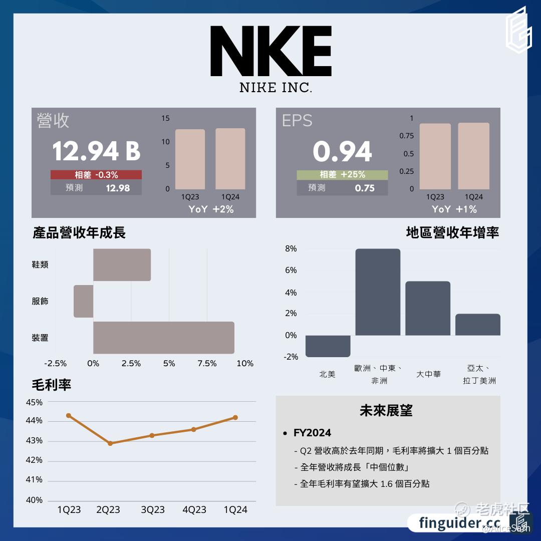 从上图看,Nike(耐克)2024财年第一季度(FY2024Q1)大概表现如下: