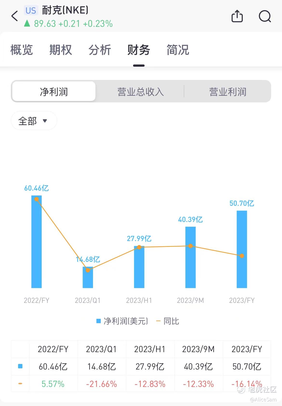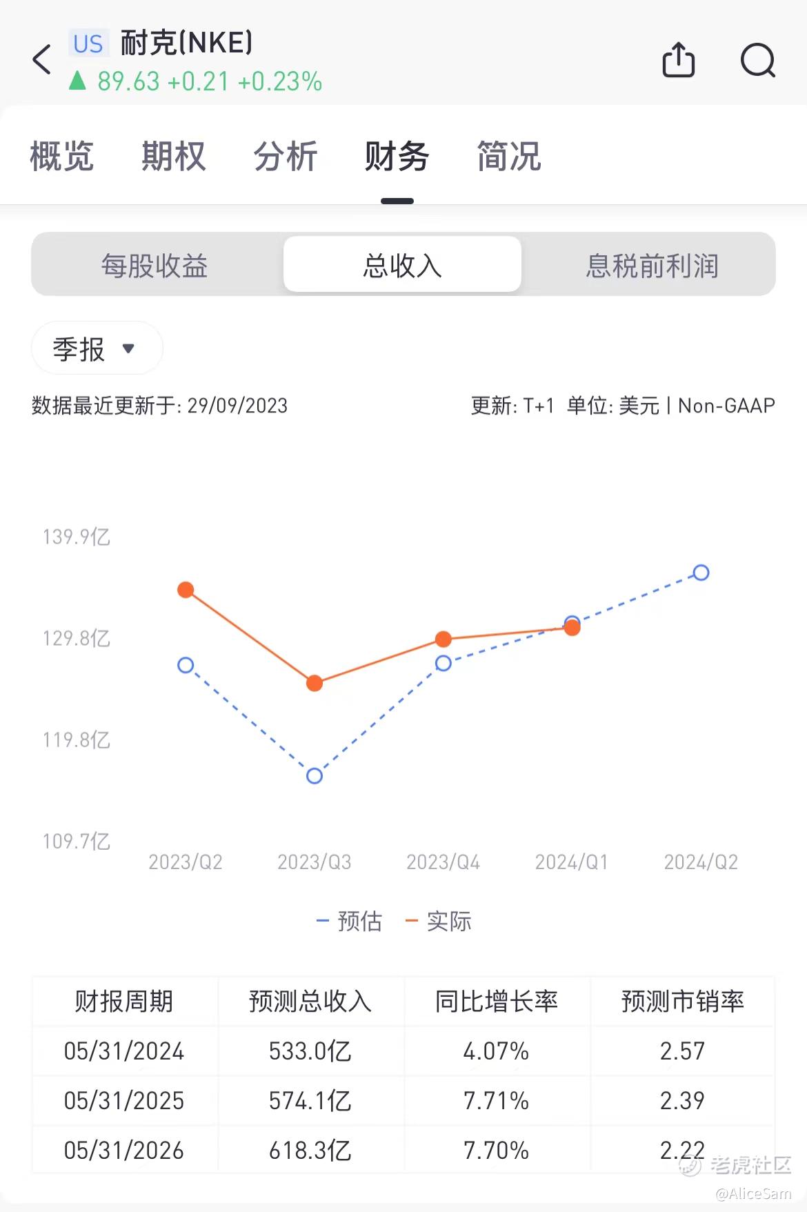 我的看财报第二眼,就是看他们公布的每股收益EPS,这次Nike公布的每股收益为0.94美元,跟去年同期相比,增长了1%,不要小看这个1%,这已经远远高于市场共识的0.75美元。这意味着公司在利润方面表现出色,超过了大家的预期。或则说,大家对Nike的预期数据,真的有点低 [贱笑],哈哈。