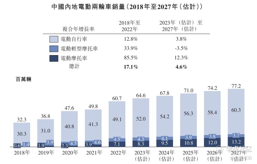 中国内地电动两轮车的总销量由2018年的32.3百万辆增长至2022年的60.7百万辆,复合年增长率为17.1%。预计中国内地电动两轮车市场的总销量将于2027年达到77.2百万辆,惟2023年起的复合年增长率低至4.6%。
