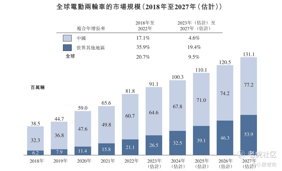 受减排政策以及电机及电池技术的进步所推动,过去五年,全球主要经济体的电动两轮车的销售量迅速增长。其中,中国内地为最有吸引力的电动两轮车市场,其总销量占2022年全球总销量的74.3%。电动两轮车的全球总销量由2018年的38.5百万辆增长至2022年的74.0百万辆,复合年增长率为20.7%。预期电动两轮车的全球总销量将于2027年达到131.1百万辆,2023年至2027年的复合年增长率为9.5%。