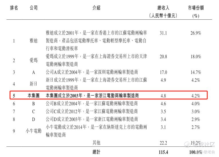 公司是中国内地电动两轮车供应商,专注于设计、研发、制造及销售电动两轮车。根据弗若斯特沙利文的资料,中国内地电动两轮车市场高度集中且竞争激烈,以2022年总收益计,公司是中国内地市场排名第五的电动两轮车制造商,市场占有率为4.2%。