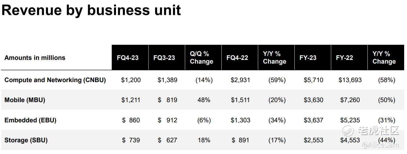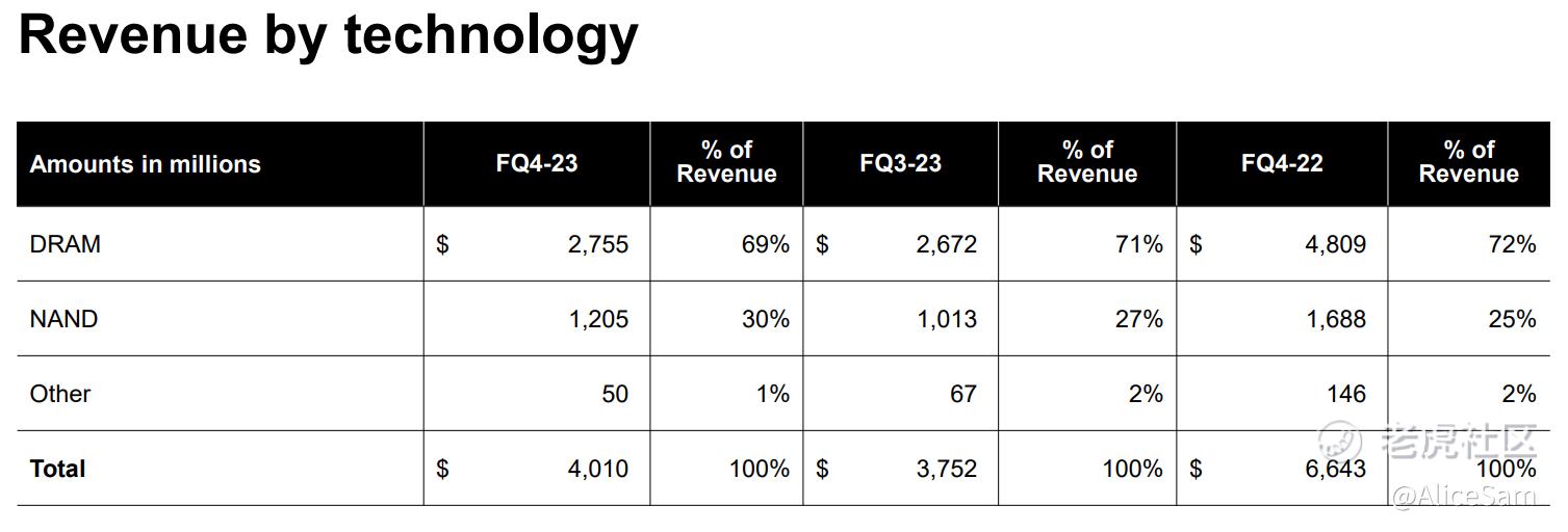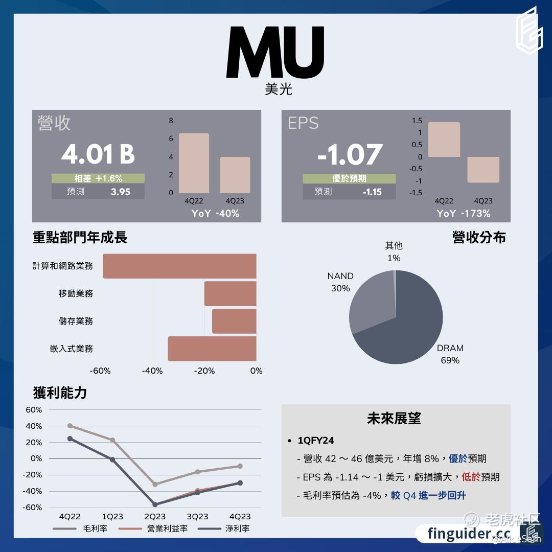 美光(MU)于2023年Q4发布的财报显示,这个季度他们的总营收为40.1 亿美元(YoY -40%)、明显的优于预期的 39.5 亿。