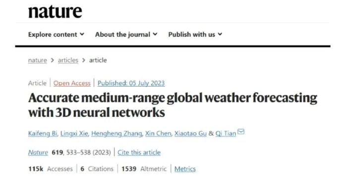 除了前面提到的无人驾驶以外,今年7月6日,华为盘古气象大模型进行气象预报的论文被刊载在《Nature》杂志正刊,引发业界广泛关注认可,这是中国公司首次单独发表在《自然》杂志上的文章,并没有其他国外科研机构的参与。