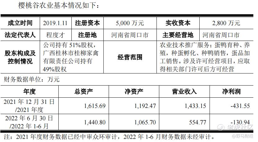 此外,2019年,樱桃谷直接与广西桂林共同成立樱桃谷农业科技有限公司,樱桃谷持股51%,广西桂柳持49%,主要从事蛋鸭育种、养殖业务。