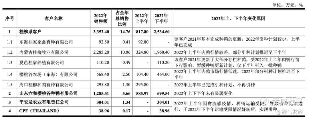 “主要由于2022年受第一季度商品苗销售价格下跌、产能去化、欧洲禽流感疫情等因素影响,部分樱桃谷祖代鸭养殖企业调整引种计划,境外运输受限,下半年肉鸭市场回暖,客户对市场行情预期提升导致销售数量增加。 ”樱桃谷表示。