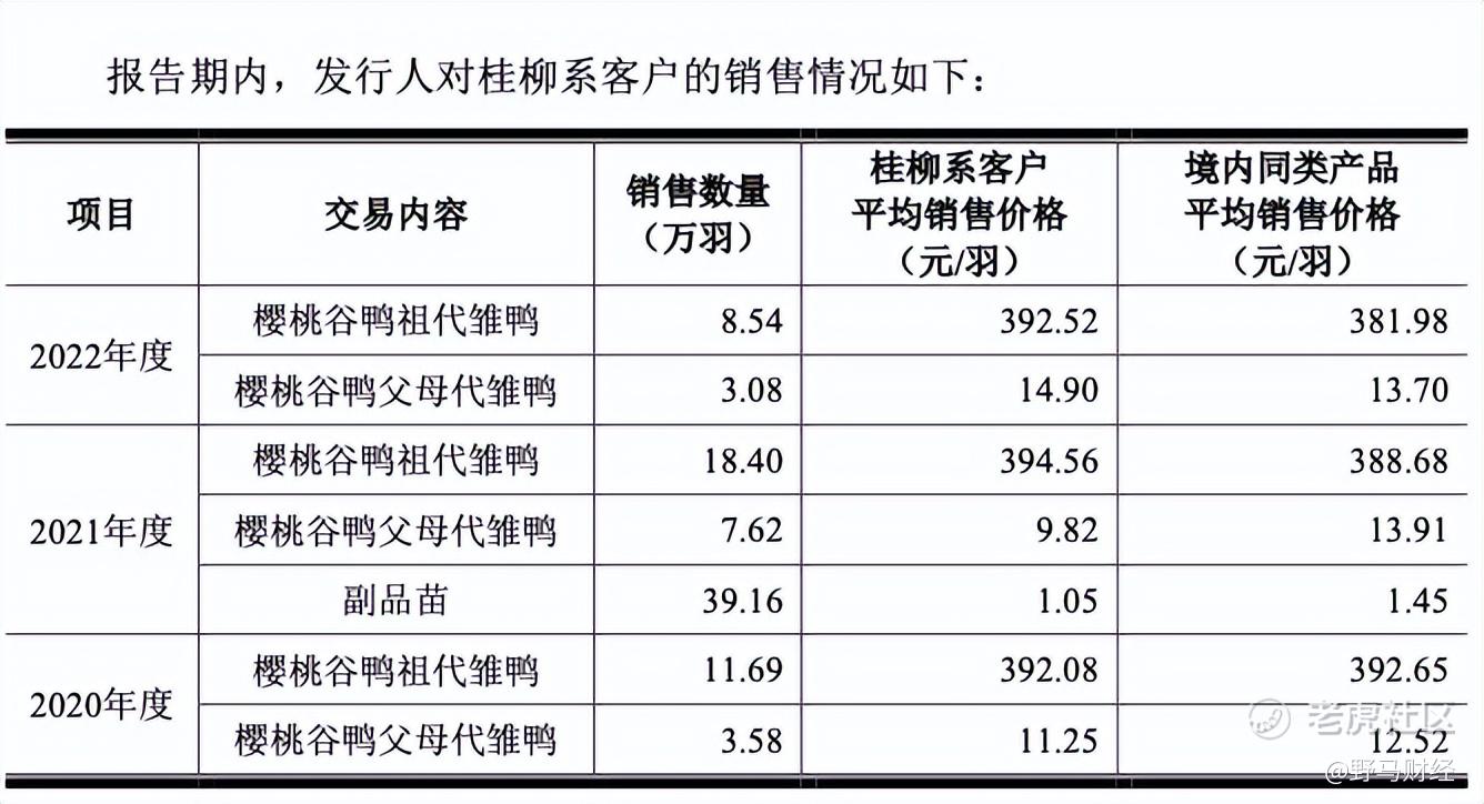 樱桃谷和桂柳系的交易价格和其他第三方,存在一定差异。《招股书》显示,樱桃谷销售给桂柳系的产品主要是祖代雏鸭、父母代雏鸭。2020年时,桂柳系客户的平均售价和同类产品相差不大;2021年,樱桃谷对桂柳系父母代雏鸭比其他同类产品低了约4元,祖代雏鸭平均售价为394.56元/只,比其他同类产品高了约6元/只;2022年,祖代雏鸭平均售价比其他同类产品高了约15元/只。