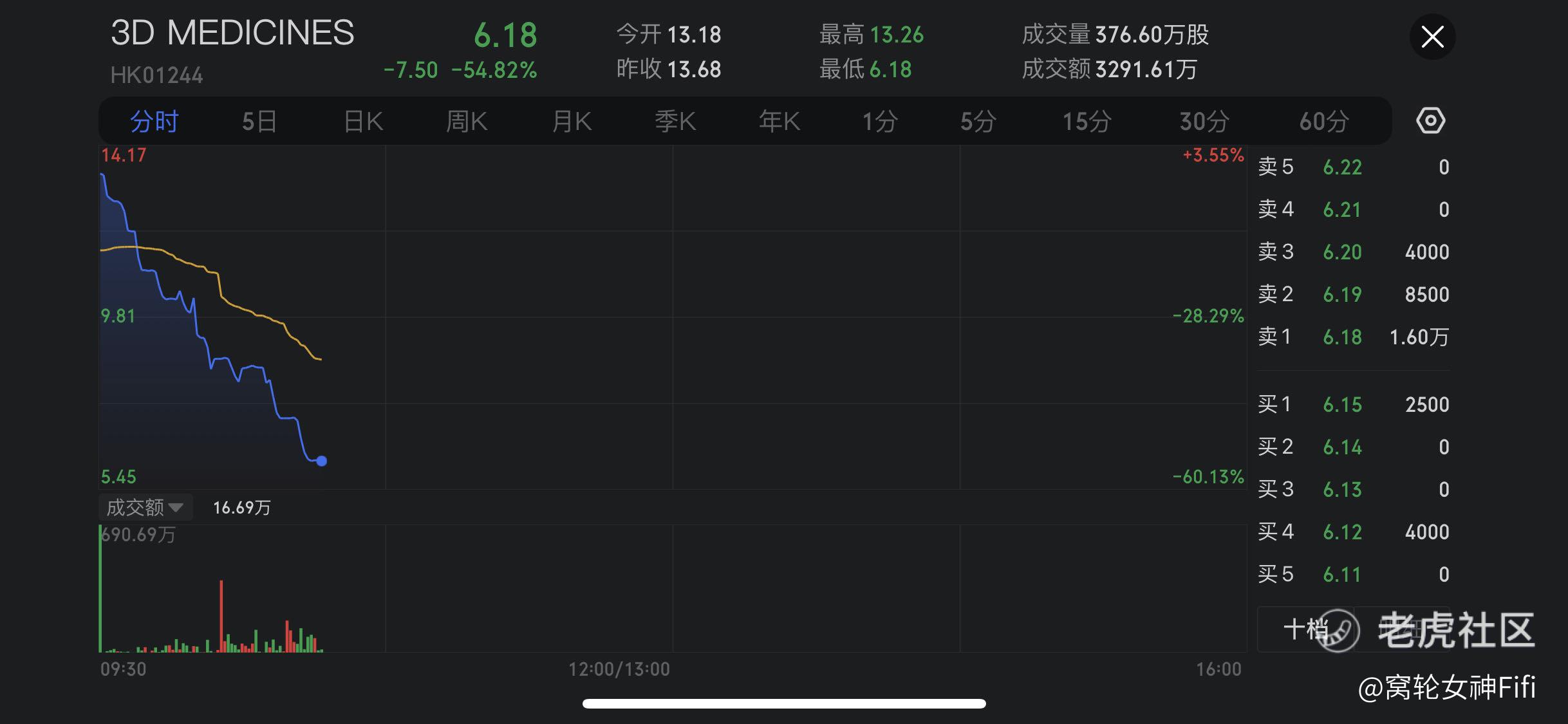 $3D MEDICINES(01244)$ 暴跌54%,低见6.18港元创上市新低。