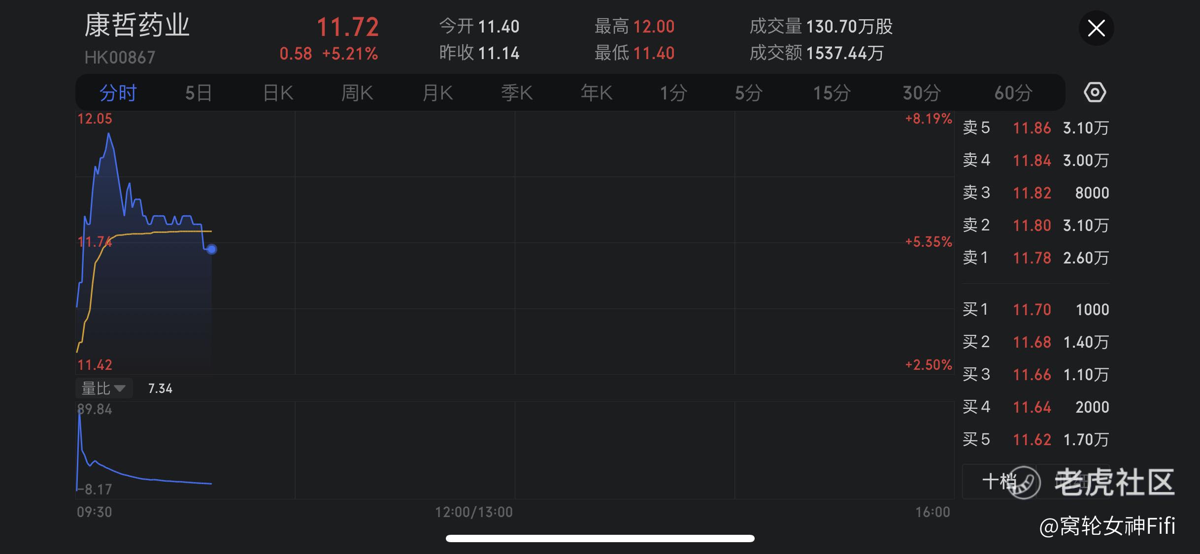 $康哲药业(00867)$ 涨超7%,截至发稿,涨5.21%,报11.72港元,成交额1537.44万港元。