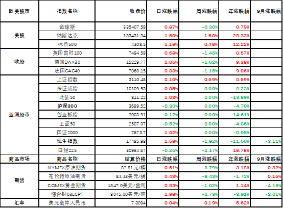 表1 股市、商品、汇率等数据(截至10月8日)