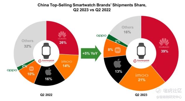 同时,根据Counterpoint Research公布的数据显示:2023年第二季度,中国智能手表市场份额中,小天才以21%的占有率位列第二,仅次于占有率39%的华为。