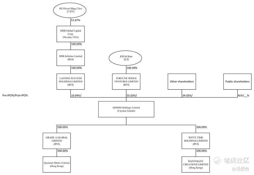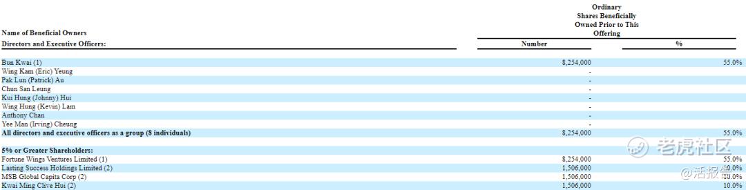 IPO前,Bun Kwai通过Fortune Wings Ventures Limited持股55%;Kwai Ming Clive Hui通过MSB Global Capita Corp控制的Lasting Success Holdings Limited持股10%。