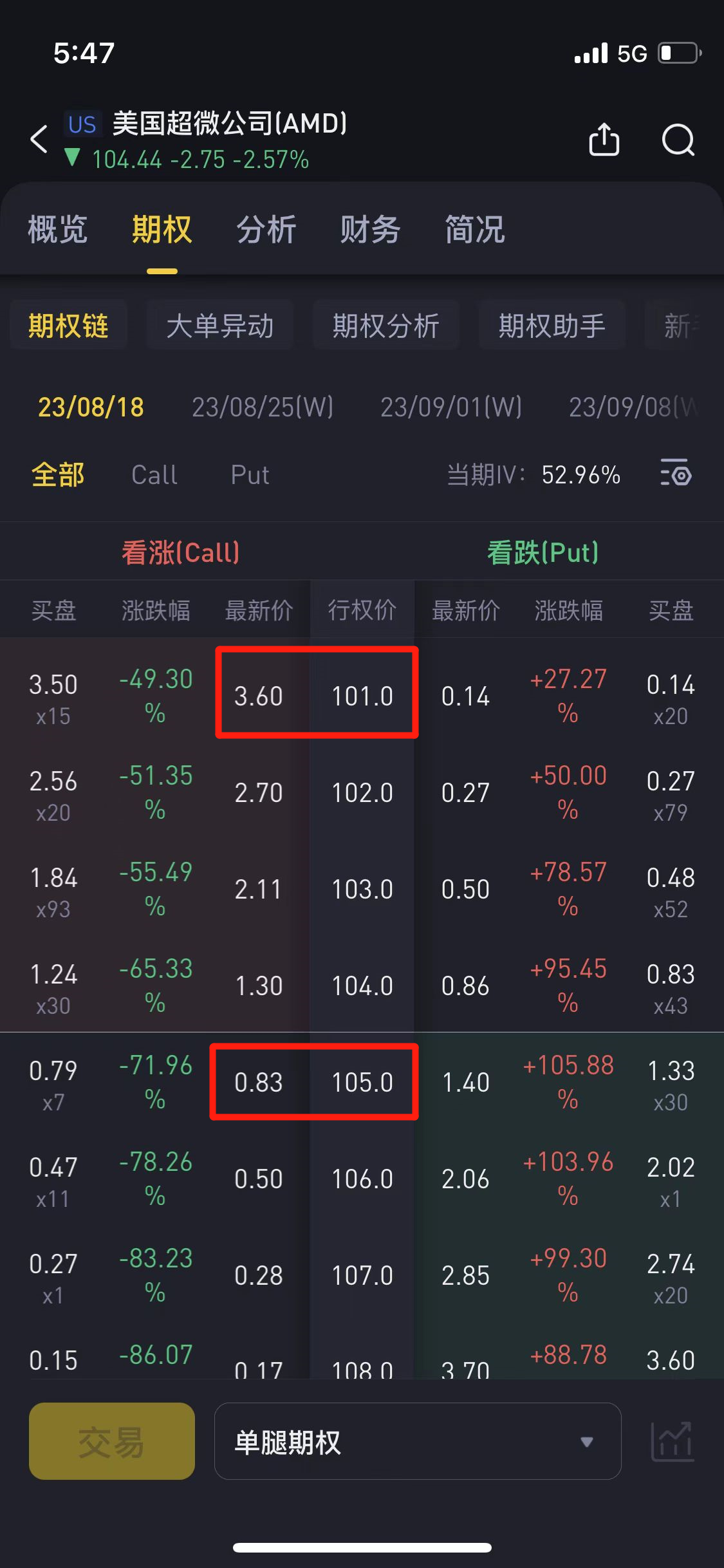 举个例子,假设AMD目前股价为104美元,我们预计未来其股价会下跌至102美元,此时首先我们可以买入一个执行价为105美元的看涨期权,花费权利金支出0.83美元,同时卖出一个执行价为101美元的看涨期权,获得权利金收入3.6美元,最终净额的权利金收入为2.77美元。
