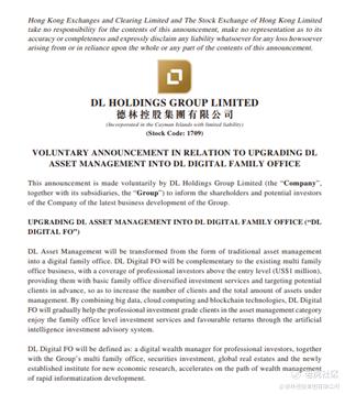 When it comes to the "Digital Family Office", it is often linked to the management of virtual assets, such as digital currencies. However, DL Holdings (1709.HK) aims to establish a genuine "Digital Family Office" that integrates big data, cloud computing, and blockchain technologies. DL Digital FO will gradually help the professional investment grade clients in the asset management category enjoy family office level investment services and favourable returns through the artificial intelligence investment advisory system. In this context, the term "digital" denotes intelligent, user-friendly, and customized financial technology, rather than limited to digital or virtual assets.