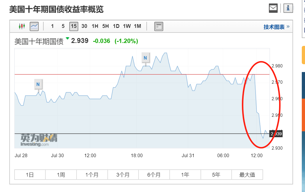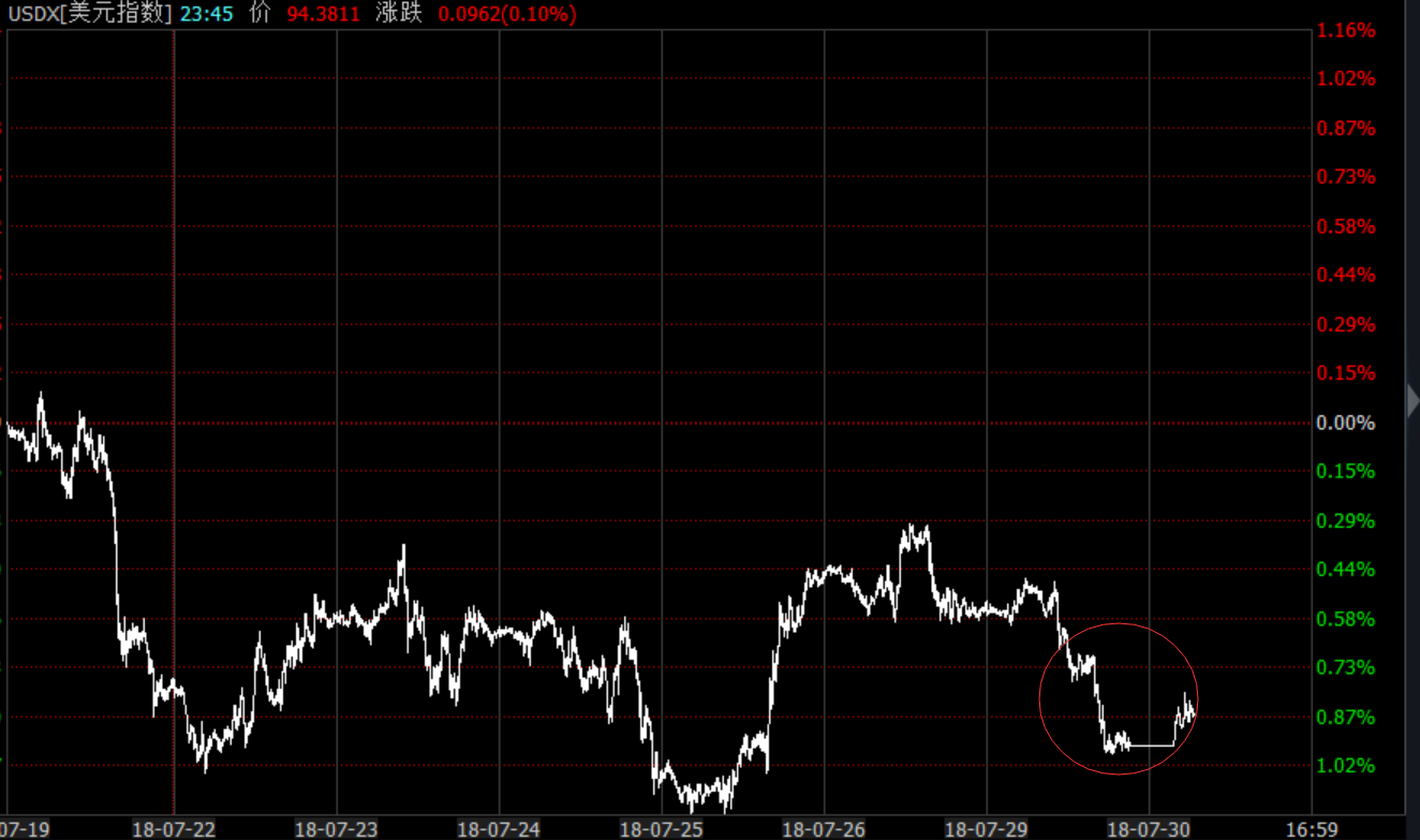 今天贬到了下图中的低位,粗略计算,从7月中旬的95.65点高位,到目前的低位,美元不到两周时间贬值了差不多上百个基点,这起码说明了,目前美元指数不是一个强势的市场,那么在经济数据这么好看的当下,这种情况是为什么呢?