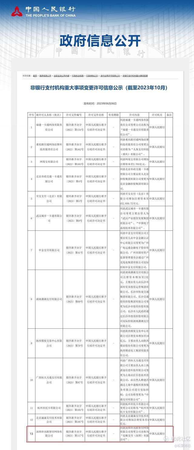 松果财经讯,近期,中国人民银行更新非银行支付机构重大事项变更许可信息,同意华为旗下支付机构讯联智付网络有限公司变更名称为“花瓣支付(深圳)有限公司”。