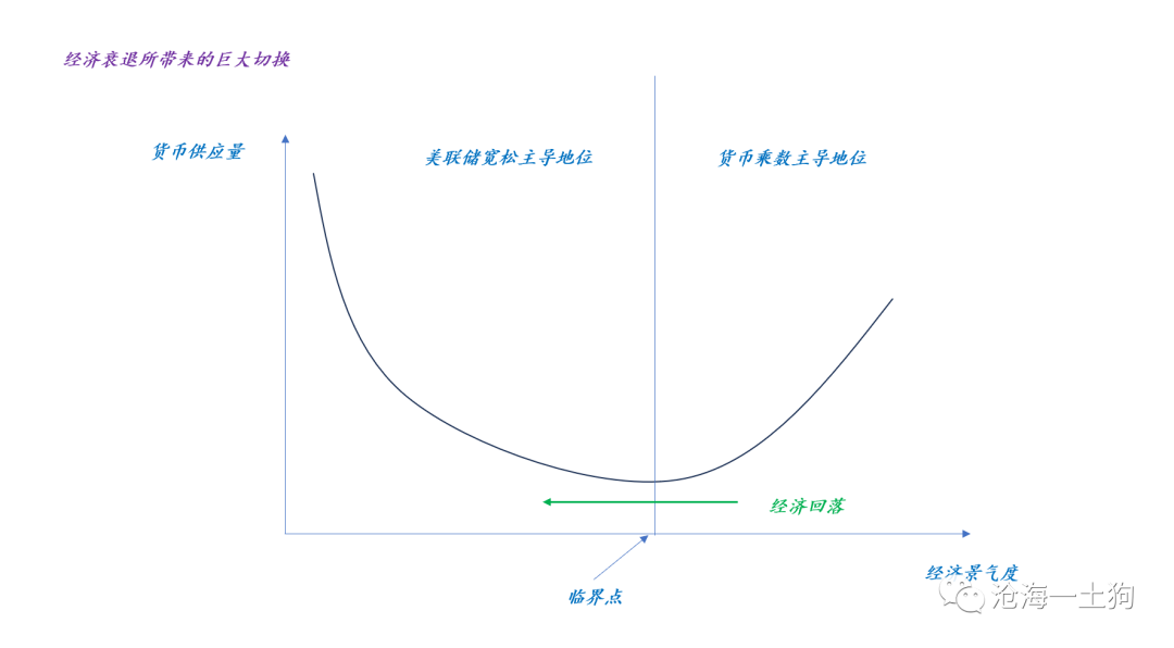在存在通胀约束的条件下,经济回落会降低货币乘数,带来货币供应量的收缩。这时美联储不会立马行动,它会等待金融收缩进一步加强经济收缩。于是,金融收缩和经济收缩会不断地相互强化,直到触及临界点,美联储开始引导两年美债利率的下行。货币供给才彻底切换为美联储宽松主导。
