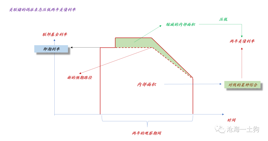 如上图所示,一个手段是确认年底不加息,这个操作会有效地降低内部面积(ps:降低量为绿色部分),即压低两年美债的利率。