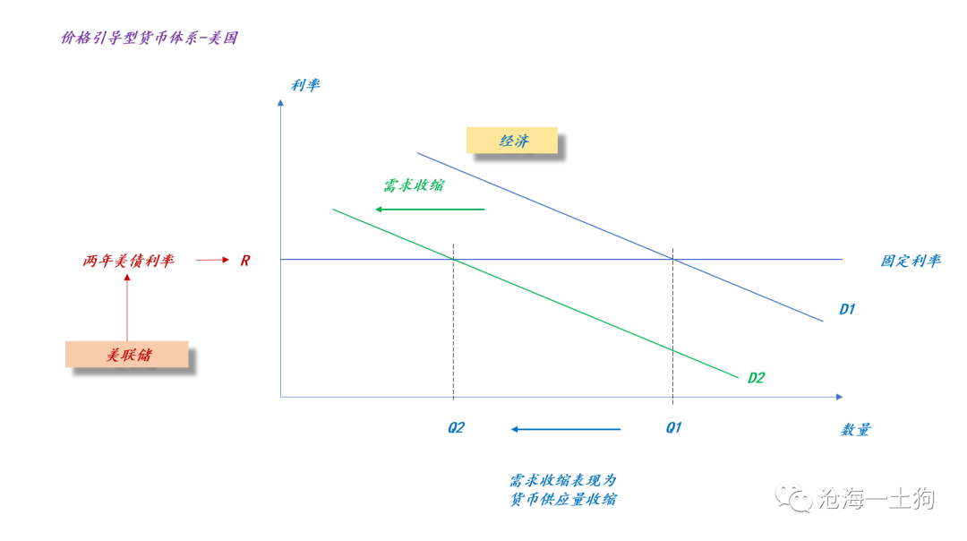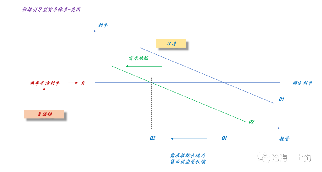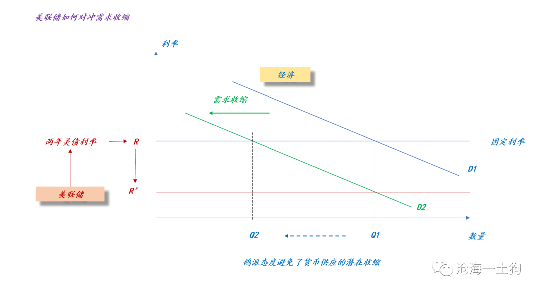 根据上文的货币供需曲线,当美联储保持两年美债利率不变时,总需求的收缩,会带来货币供应量的减少,即Q1减少到Q2。