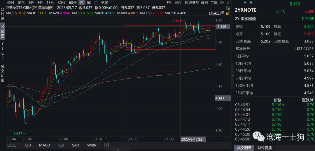 从目前的实际情况来看,即便很多美联储官员已经放鸽,但是,市场还是不敢恣意妄为,两年美债依然保持在5.10%的高位。