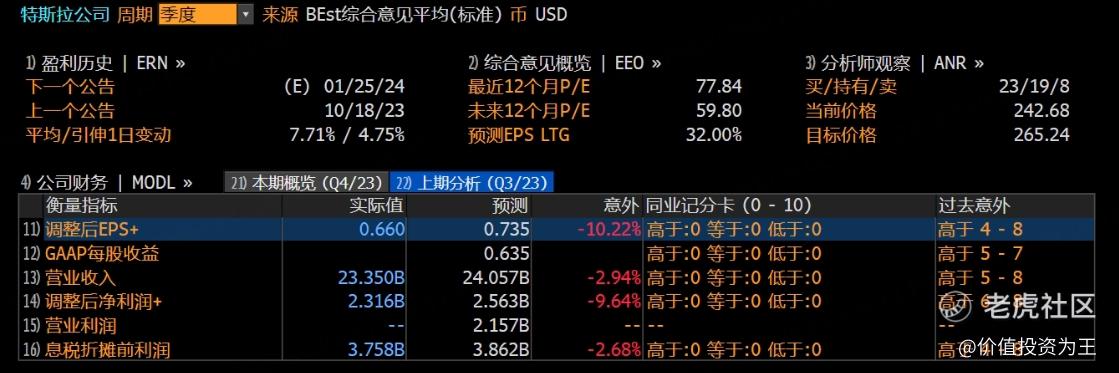 昨日美股盘后,特斯拉公布了三季报,营收和利润全面低于分析师预期,股价下挫4.24%: