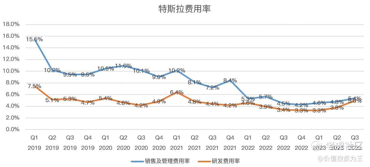 整体毛利率略有下滑,但净利率下滑幅度更大,主要是特斯拉的费用率明显提升,其中销售及管理费用率为5.4%,研发费用率提升至5%: