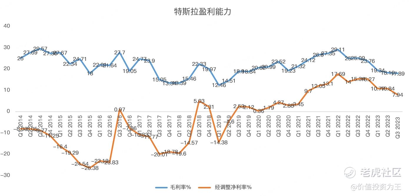 收入低于预期,盈利更是惨不忍睹,三季度特斯拉毛利率为17.89%,低于分析师预期的18.28%,经调整后的净利率更是降至7.94%,这样的盈利水平甚至连传统燃油车企都不如: