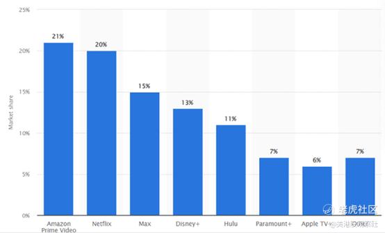 更积极的是,Statista在2023年上半年的数据显示了美国订阅视频点播(SVOD)领域的显著趋势。亚马逊Prime Video在市场份额方面表现出色,占据了21%的市场份额。紧随其后的是Netflix和最近重新推出的Max,分别占据了20%和15%的市场份额。这些数据突显了SVOD行业内的竞争动态,Max在相对短的时间内取得了重大进展。