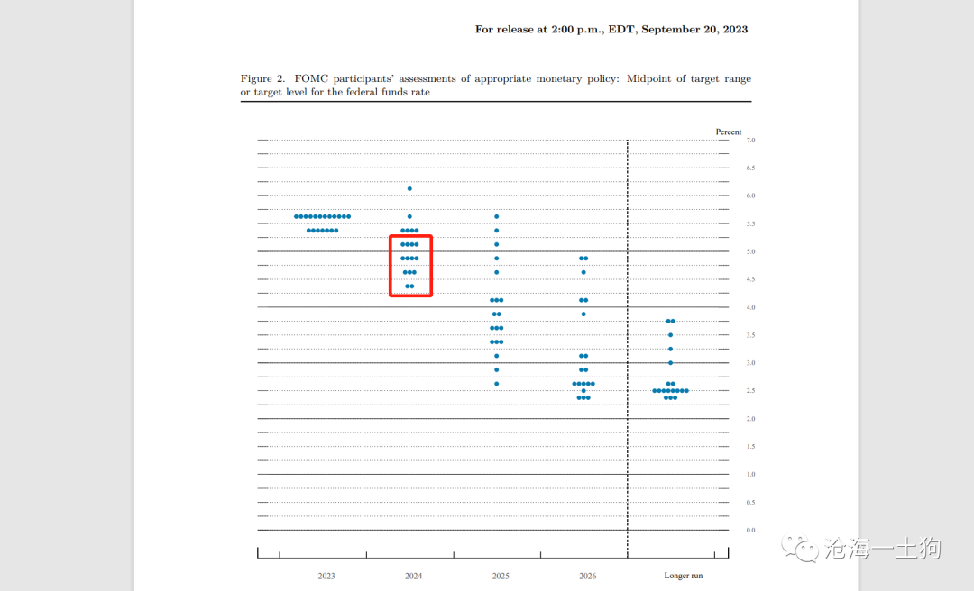这份点阵图认为,1、年底前还有一次加息;2、明年有两次降息。