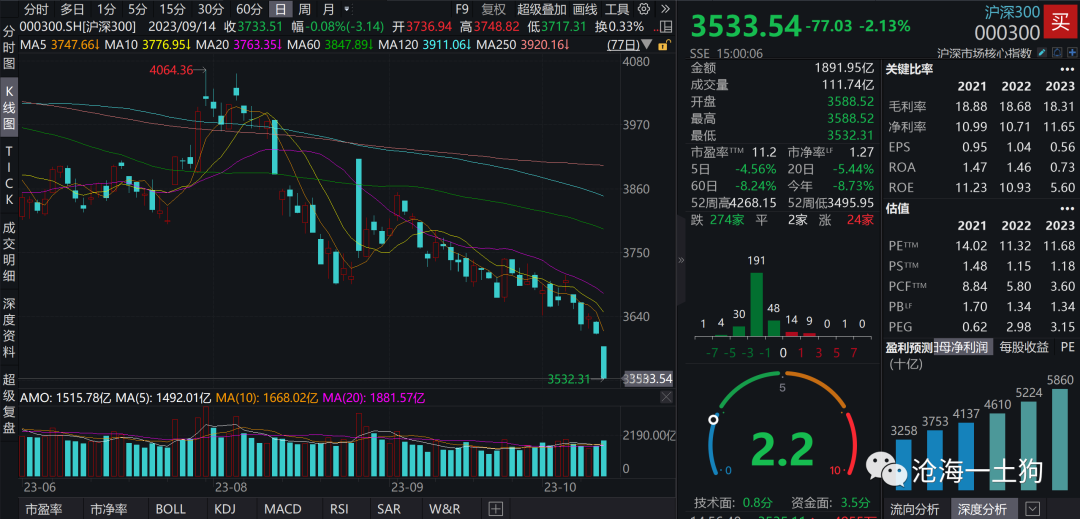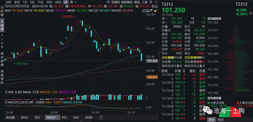 今天沪深300指数下跌2.13%,十年国债期货T2312下跌0.30%,主要原因还是来自于海外流动性的快速收缩。